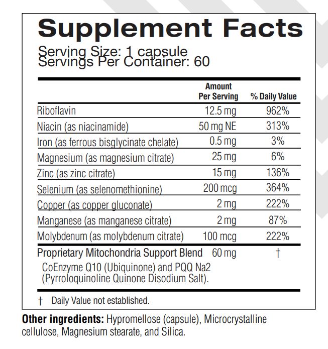 Magnesium— Plays a vital role in the energy production pathway within the mitochondria, enhancing their overall functional role*